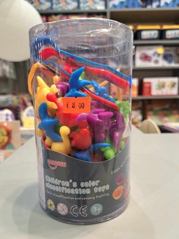 Rinkinį sudaro: 36 spalvotos dinozaurų figūrėlės, 2 žnyplės, 6 spalvoti indeliai.