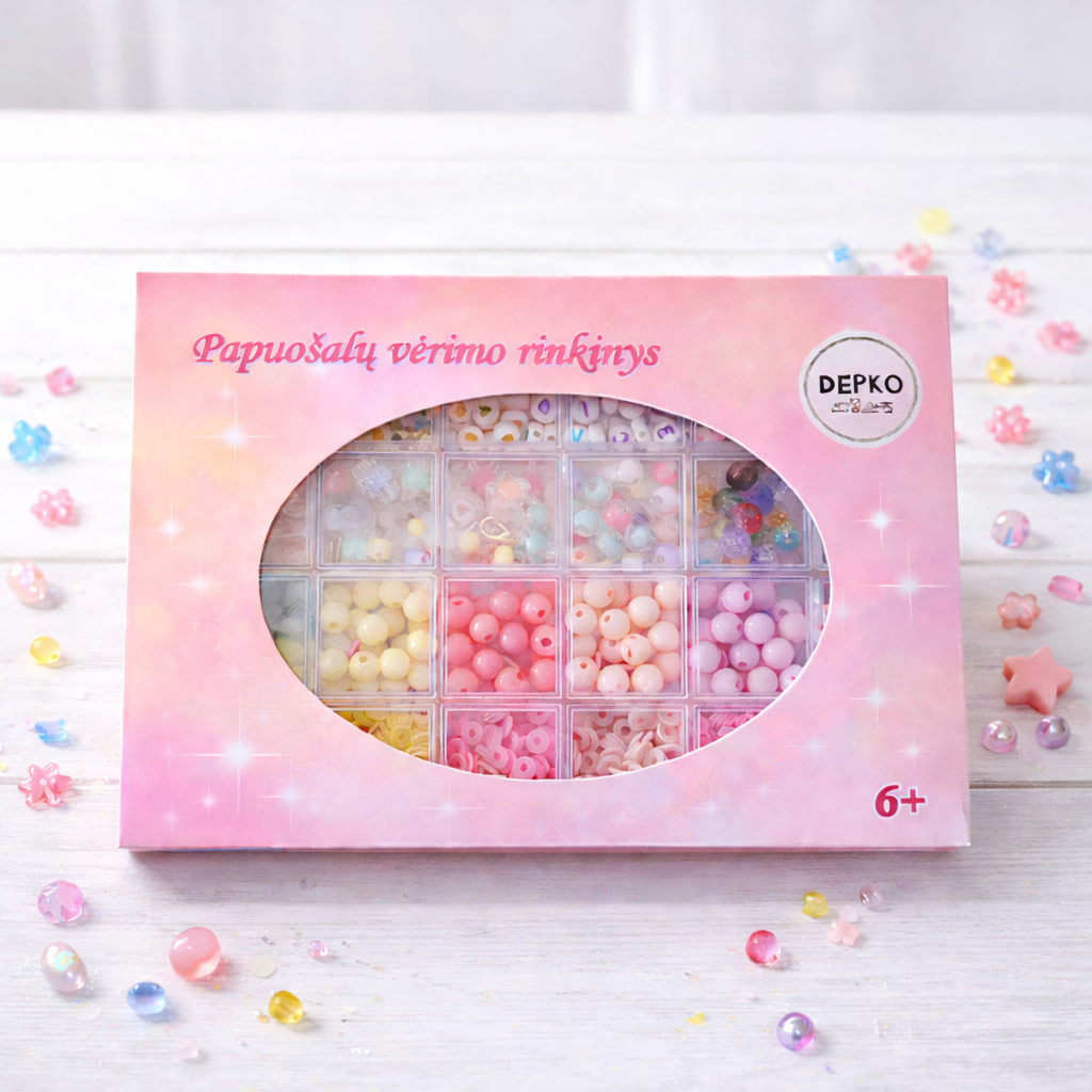 Iš gausybės rinkinyje esančių įvairių formų ir spalvų karoliukų  bus galima sukurti ne vieną nuostabią apyrankę ar kaklo papuošalą, padovanoti jį mamai, draugei ar pasilikti sau!  Papuošalų vėrimas lavina smulkiąją motoriką, akies-rankos koordinaciją, skatina kūrybiškumą.