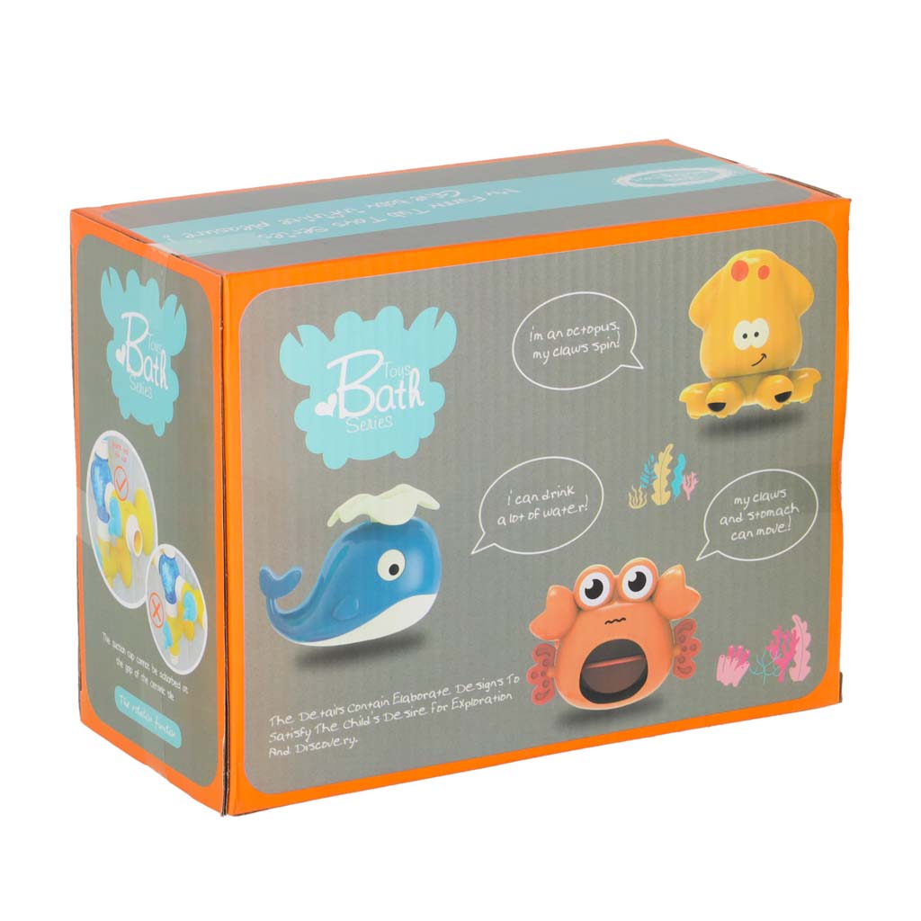 Rinkinį sudaro spalvingų vamzdelių sistema su vožtuvais, kuriuos galima sukti, jungti ir reguliuoti vandens srovės kryptį. Vanduo pilamas į viršų, o tada jis laisvai teka per visą sistemą ir išsilieja per trijų žaismingų jūros gyvūnėlių purkštukus!